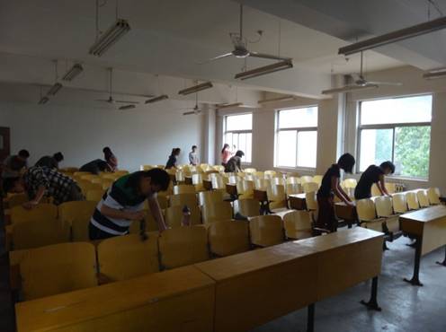 为了进一步推进我院受助学生的感恩诚信教育,给同学们营造良好的学习环境,艺术与传媒学院金花、未央校区受助学生于2012年5月21日中午在金花校区教6楼4层以及未央校区教C楼4层教室开展了清除桌面污垢和教室卫生的义务劳动。