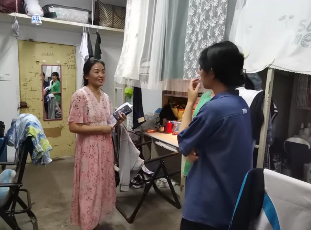 会议结束后,董丹丹走进学生宿舍进行走访排查,时刻关注学生思想动态。