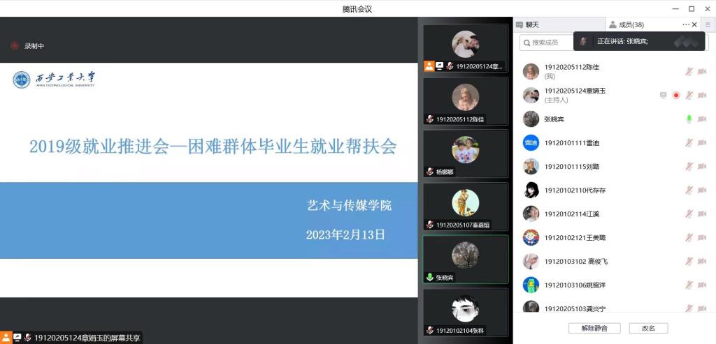 为切实做好我院2023届困难群体毕业生“一对一”帮扶工作,全力促进毕业生更加充分更高质量就业。2月13日,我院召开线上困难群体毕业生就业推进会。学院党委副书记张晓宾出席会议,2019级就业大使章娟玉主持会议,2019级辅导员杨娜娜,优秀就业学生代表秦嘉煊以及毕业班36名困难群体毕业生参加会议。
