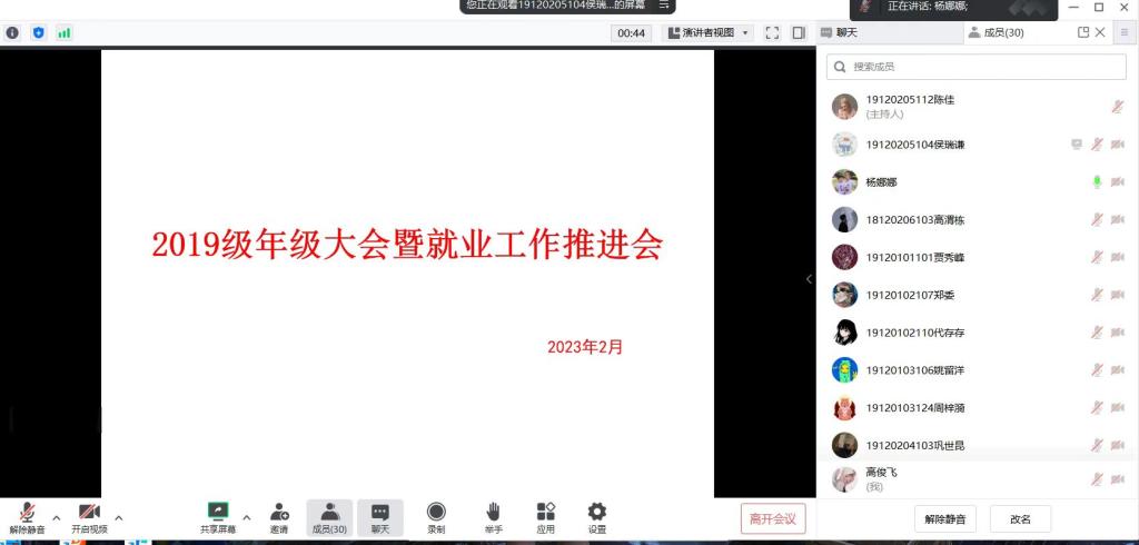 为更好地促进2023届毕业生就业工作,并积极落实新学期学院工作安排, 艺术与传媒学院2019级于2月24日晚8点线上组织召开“2019级年级大会暨就业工作推进会”。辅导员杨娜娜主持,2019级全体学生参会。