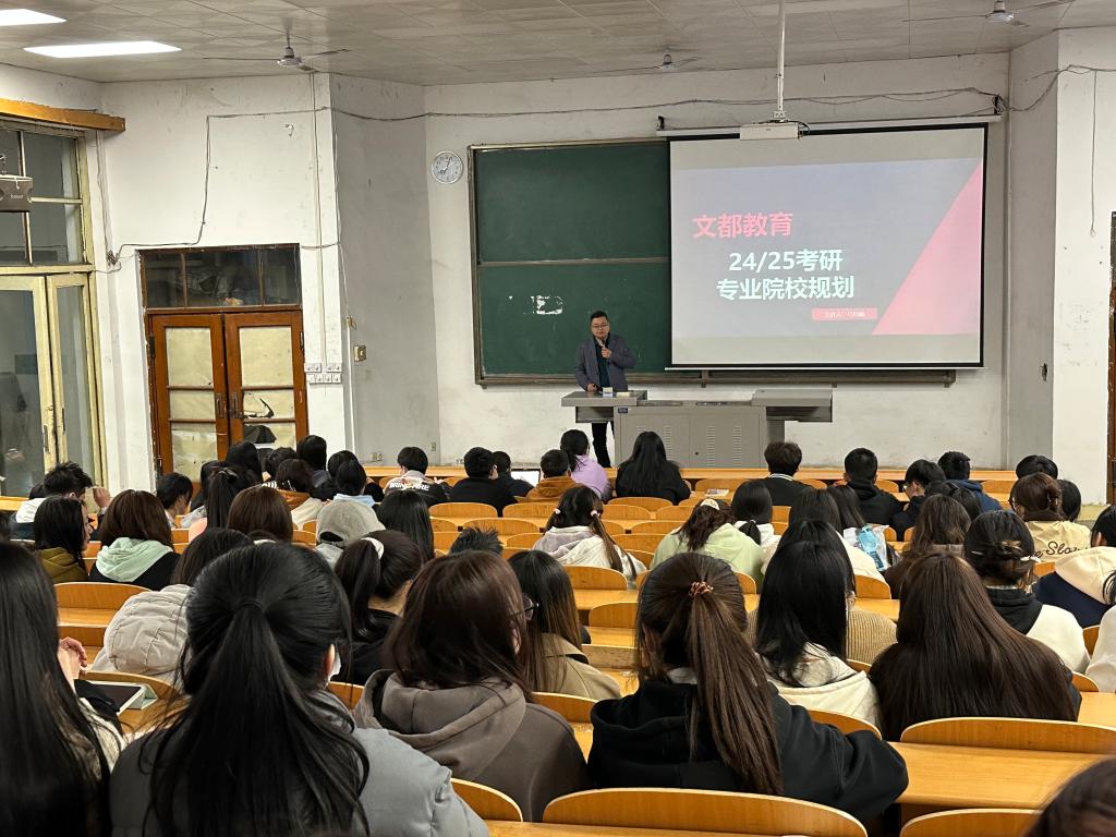 为激发学生考研热情,进一步帮助学生做好考研规划,明确考研目标。3月22日、3月23日,我院邀请文都教育马回峰、王巧红两位老师分别开展考研规划、考研英语公益性讲座,学院近200人参加了此次讲座。