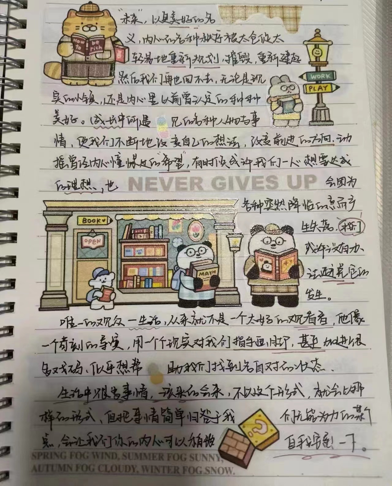 笔记反映的是学生上课的质量、效率和学习态度,使课堂教学内容具像化,从而更好地提升自己的学习能力和综合素养。本次活动评比范围为连续7天的学习笔记,最终从笔记的字迹工整、认真程度、完整程度、时间持续等方面评比,选拔出一等奖一名、二等奖两名、三等奖两名以及优秀奖三名。