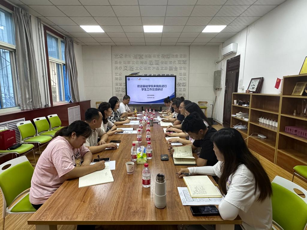 会上,周著对基础学院一行人的到来表示热烈欢迎,表示两个学院齐聚于此,共同探讨学生工作,分享经验、互相交流,能有效推动学院的思想政治工作、落实立德树人根本任务,促进学院高质量发展。张英就此行交流目的进行说明,希望能够在学院特色工作、学生永利集团以及团学组织建设等方面进行交流。张晓宾以题为“深挖潜力 激发活力 强化能力”对我院学生工作进行汇报,杨娜娜以题为“学生党建‘1+N’多维引领促成长”对我院学生第三党支部省级样板党支部建设工作进行汇报,董丹丹就我院全省高校团建标杆院系培育单位工作情况进行汇报,周著介绍了我院近几年毕业生就业工作举措和成效,以及以项目制学生管理在学生日常管理的具体做法。