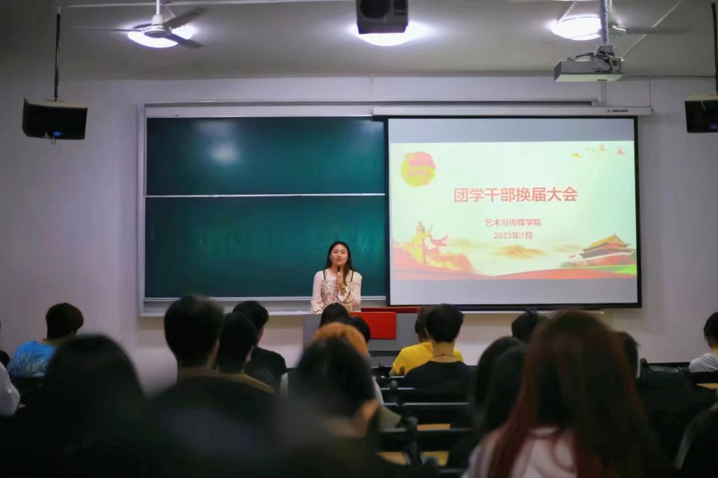 为强化团学干部队伍建设,推进团学工作再上新台阶。艺术与传媒学院于7月3日在金花校区教2-207举行了团学干部换届大会。会议由学生会主席饶磊主持,团委书记杨娜娜、团委副书记董丹丹及团委、学生会、蒲公英志愿者协会的一百余名同学参加了本次大会。