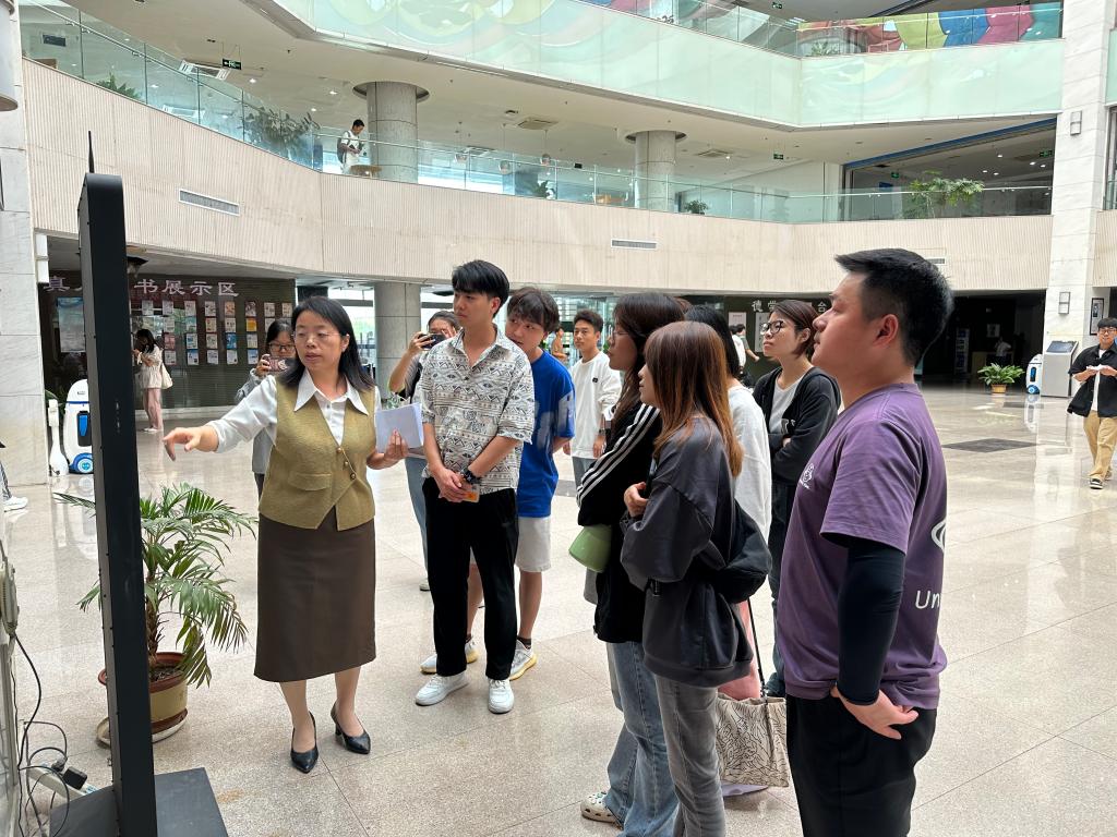 图书馆李艳老师带领同学们进行参观,进入馆内工作人员向同学们介绍了图书馆的发展历程、馆名由来、建设过程、区域分布、开放时间等基本概况,随后,同学们逐层了解了图书馆各层馆藏,书籍库,自习室等设施分布。工作人员还向同学们介绍了如何高效的利用线上资源借书,查阅资料的相关流程。最后,图书馆管理人员还回答了同学们在图书借阅中的一些具体问题。