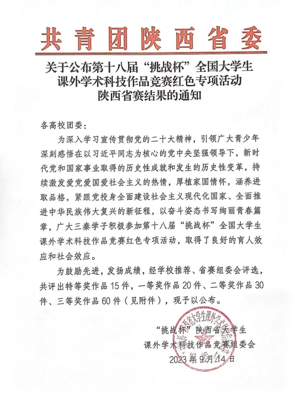 本次荣誉的取得,不仅展现了我院学子脚踏实地、锐意创新的进取精神,也展示了我院在促进创新型人才培养、深化素质教育等方面取得的积极成果。今后,我院将持续依托“挑战杯”这一重要竞赛平台,培养学生创新创业能力,不断提升人才培养质量,不断开拓我院以赛促教、以赛促学、以赛促创的育人新局面。