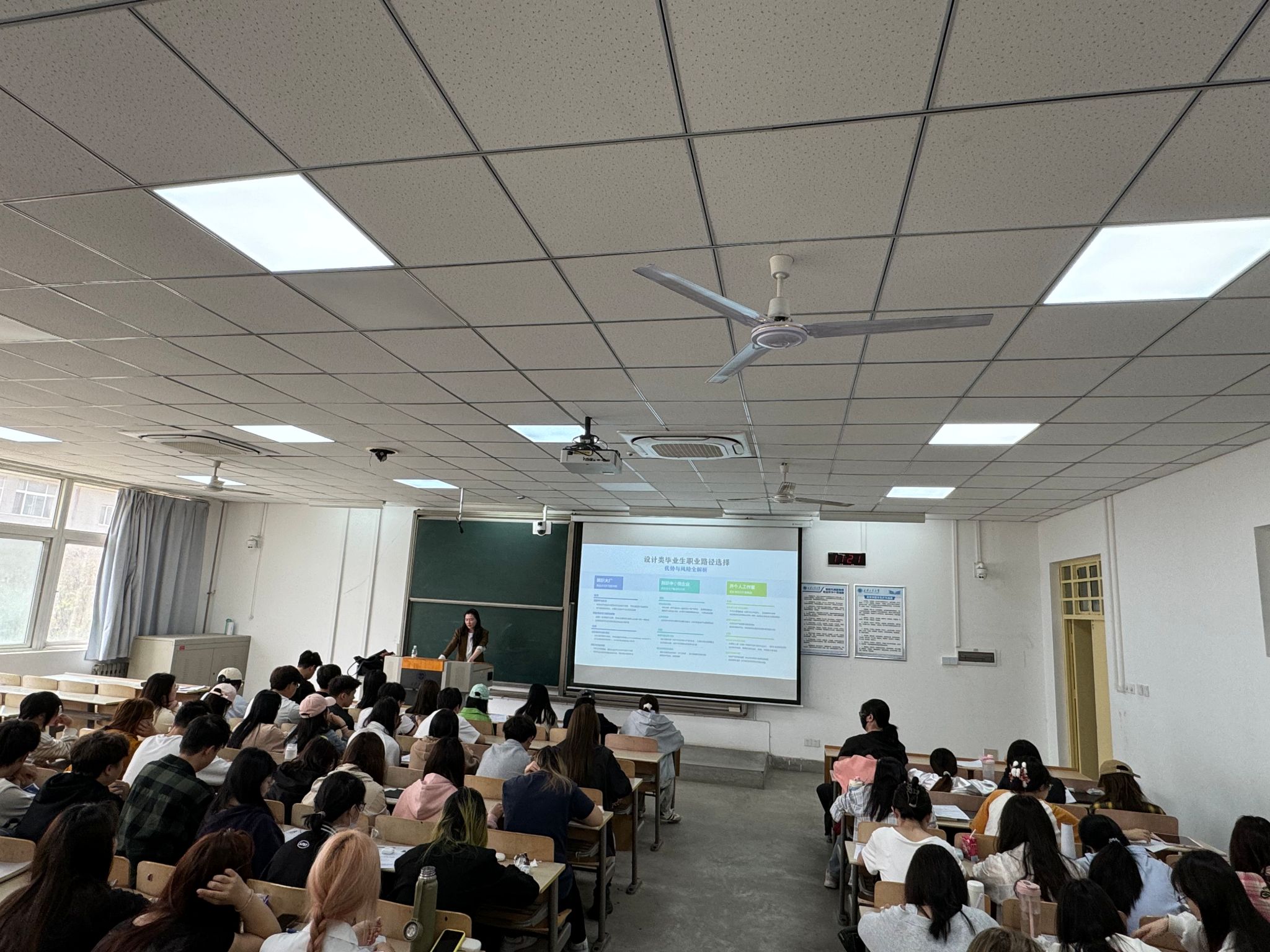 本次活动特邀了辰知科技技术有限公司和三乘万物文化传播有限公司负责人荣燕,围绕“未来设计行业的就业趋势与路径选择”这一主题进行分享。荣燕对专业当前的就业形势进行了深入分析,并分享了如何在竞争激烈的职场中脱颖而出。她对跨界合作、创新设计思维和持续学习的重要性进行了强调,同时,为学生们提供了在简历筛选、面试中如何突出自身优势等实用的求职建议和公司对毕业生的用人需求。现场气氛活跃、互动频繁,学生们纷纷表示在宣讲中获得了有益的就业方向指导。