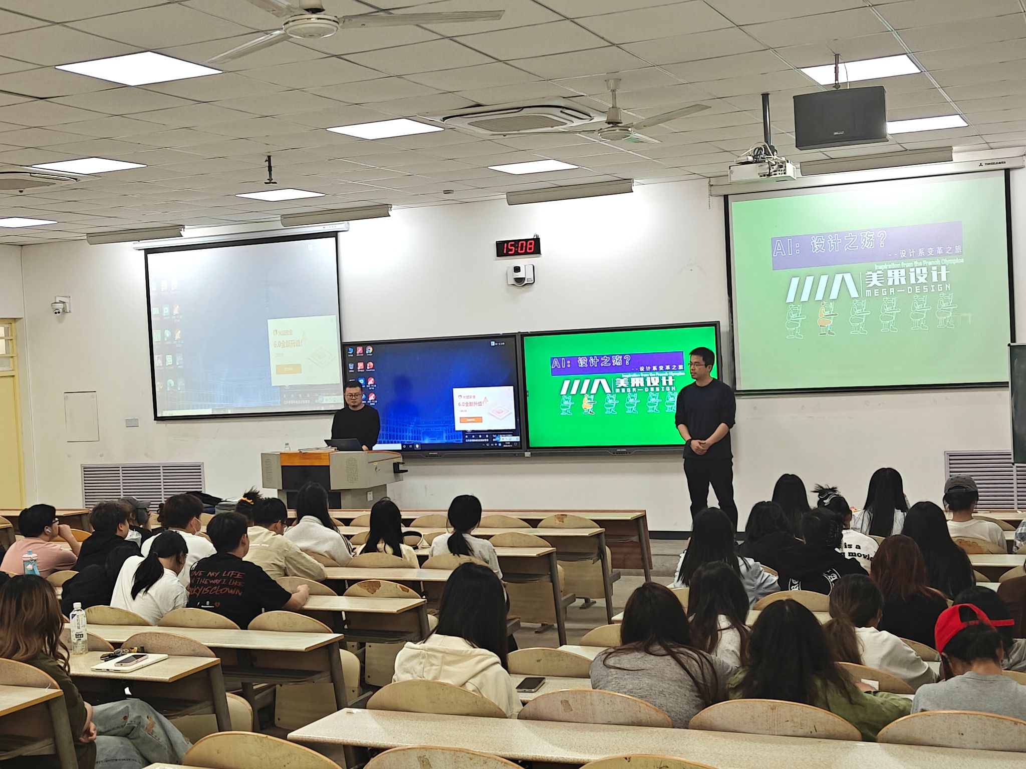 本次活动邀请了西安美果科技教育有限公司联合创始人、品牌总监牛奔,围绕“AI与艺术创作--传统设计变革之旅”这一主题进行分享。牛奔对视觉传达设计专业AI发展涉及到的如:LilibAI、Deepseek、ChatGPT、星流等AI模型进行了详细讲解,并对就业市场的人才需求进行分析,鼓励学生们提前做好职业规划,为未来的就业打下坚实基础。会上,牛奔还分享了优秀学生的实习与工作经历,讲述了他们从学校到职场的转变,并为在场学生提供了关于实习的宝贵建议。现场互动氛围活跃,学生们表示,此次宣讲帮助他们拓宽了专业视野,为眼前的实习和就业奠定了坚实基础。