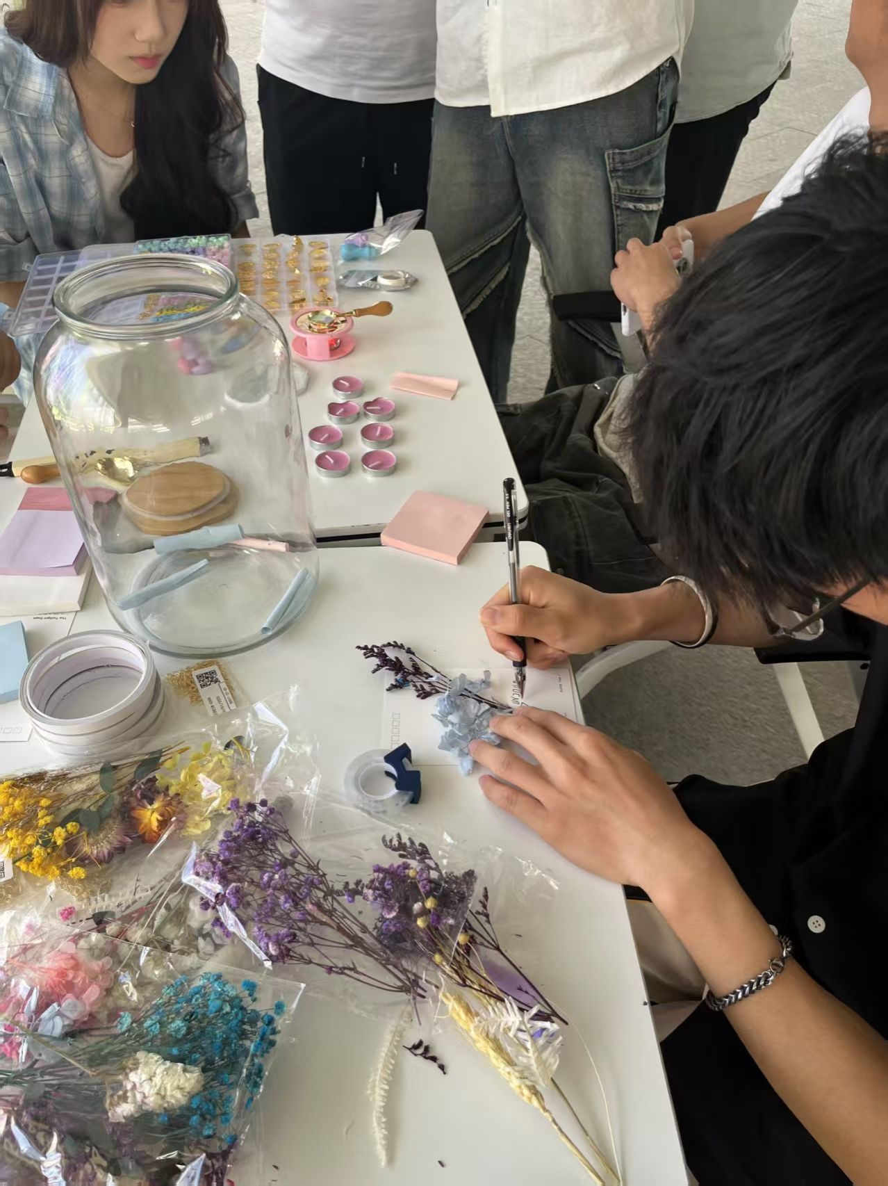 花语心声环节,学生用色彩缤纷的干花材料与款式多样的明信片搭配,创作专属于自己的心声卡片。活动现场,玫瑰、满天星、勿忘我铺满长桌,参与者通过修剪、拼贴、塑封等步骤,将自然之美凝固于方寸之间。“心灵树洞·情绪胶囊”活动中,大家匿名写下近期困扰或心愿,投入情绪瓶中,让烦恼通过纸条发泄诉说。瓶中满满的彩色便利贴也承载着学生缤纷的情绪。收集最美笑脸环节,参与活动的学生留下了自己的最美笑脸,定格在照片墙上。展板上青春洋溢的笑脸照片,记录了大家幸福的瞬间。本次心理嘉年华通过沉浸式体验活动打破传统宣教模式,将心理健康知识融入趣味互动中,有效提升心理健康教育实效。
