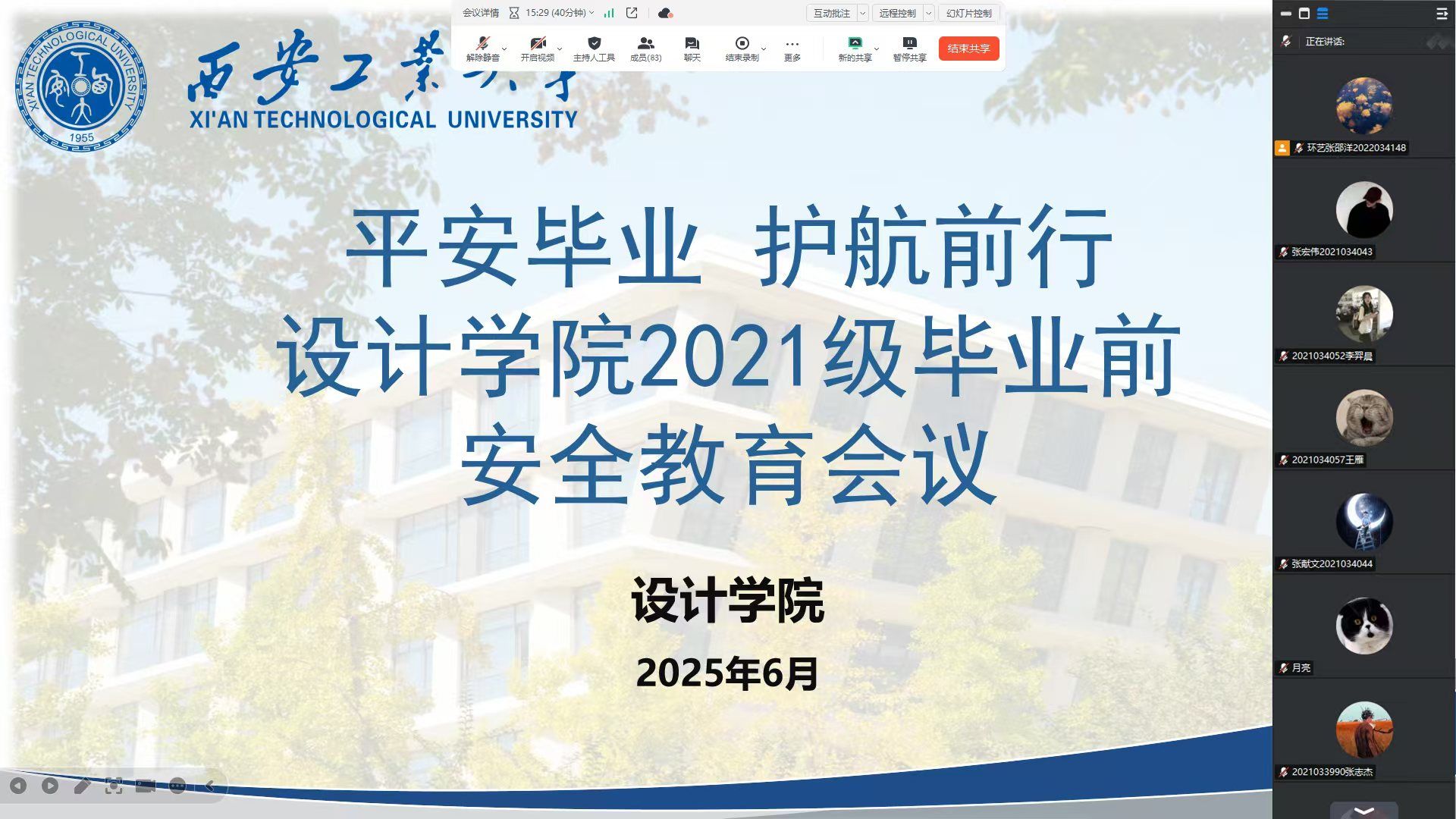 会上,杨娜娜结合近期校园及社会上发生的安全案例,从人身安全、财产安全、交通安全等多个方面进行详细讲解。随后,在心理健康教育环节,杨娜娜关注到毕业季同学们可能面临的心理波动,如对未来的迷茫、就业压力带来的焦虑等。她分享了一些实用的心理调适方法,建议同学们多与家人、朋友、老师沟通交流。最后,杨娜娜还对毕业生离校手续办理、档案转递、户口迁移等相关事宜进行了细致的说明,确保每一位同学都清楚了解毕业流程,顺利完成离校手续的办理。此次毕业前安全教育会议的召开,进一步强化了毕业生的安全意识,为毕业生顺利离校和安全就业奠定了坚实基础。