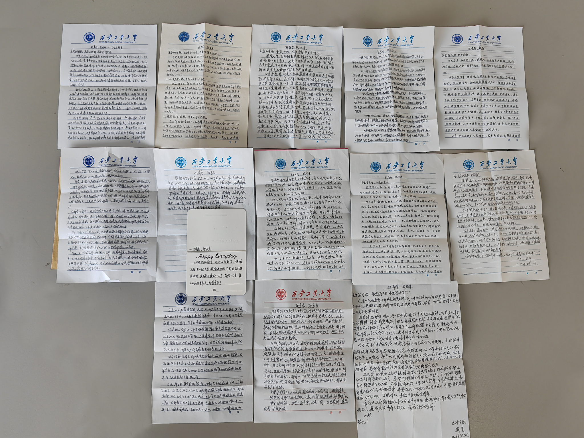 活动现场,毕业生们深情回顾成长历程,落笔处皆是深情,字里行间流淌着对往昔的感恩与未来的期许。有的学生回顾大学时光里参与设计项目的日夜,从灵感枯竭到创意迸发的蜕变;党员学生聚焦组织生活带来的思想淬炼,分享在理论学习与实践服务中筑牢信仰根基的心路历程;少数民族学生感言学校、学院对少数民族学生的关心关爱,自己要将“石榴籽”般的团结关爱化作创新动能,用设计智慧为产业升级注入青春力量。信笺上,有“愿母校桃李满园、再谱华章”的真挚祝福,也有与“珍惜时光、勇于探索”的学弟学妹寄语。