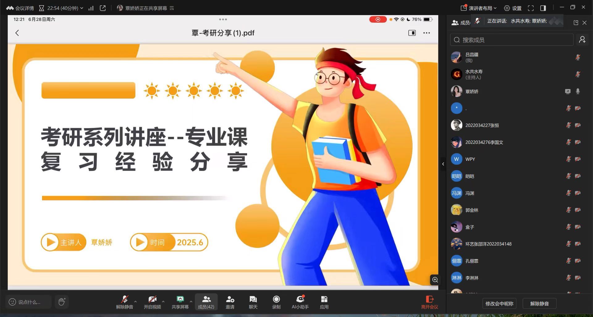 为充分发挥朋辈引领作用,助力考研学子科学备考,永利集团88304于6月29日线上召开2026届研究生备考经验分享交流会。辅导员洪涛主持。