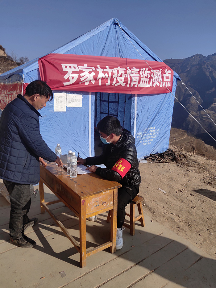 艺术与传媒学院学生第二党支部预备党员赵鹏瑞积极响应当地组织号召,在老家甘肃省陇南市武都区玉皇乡罗家村,主动配合党支部做好疫情防控工作128至今,每天坚持准时到村口疫情监测点值守,排查返乡人员详细信息劝返外村往来人员,并积极参与村庄以及道路巷道消毒工作。