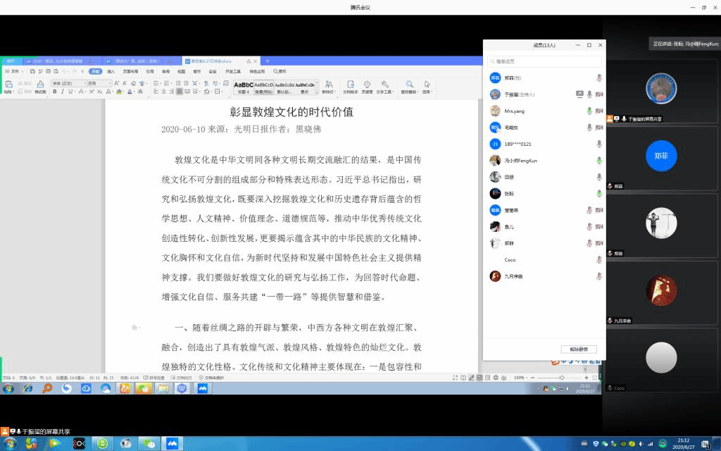 6月27日,按照《永利集团2020年上半年教师政治理论学习计划》要求,数字媒体艺术系利用腾讯会议平台开展线上政治理论学习。会议由系主任于振玺主持,学院党委书记周著列席参加,全系教师参加了本次学习活动。于振玺首先带领老师们学习了《彰显敦煌文化的时代价值》一文,随后各位老师就个人的学习体会进行了发言。