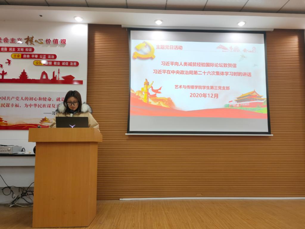 12月15日上午,艺术与传媒学院学生第三党支部组织学习《习近平总书记在中央政治局第二十六次集体学习时的讲话》和《习近平总书记向人类减贫经验国际论坛致贺信》,支部书记张晓宾主持,学生第三党支部全体学生党员参加会议。