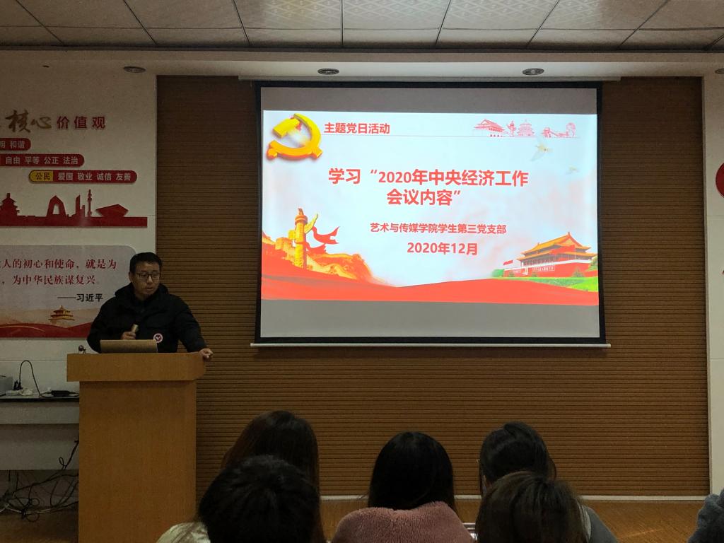 12月15日上午,艺术与传媒学院学生第三党支部组织学习《习近平总书记代表党中央、国务院和中央军委祝贺探月工程嫦娥五号任务取得圆满成功的贺电》和《2020年中央经济工作会议》内容,支部书记张晓宾主持,学生第三党支部全体学生党员参加会议。