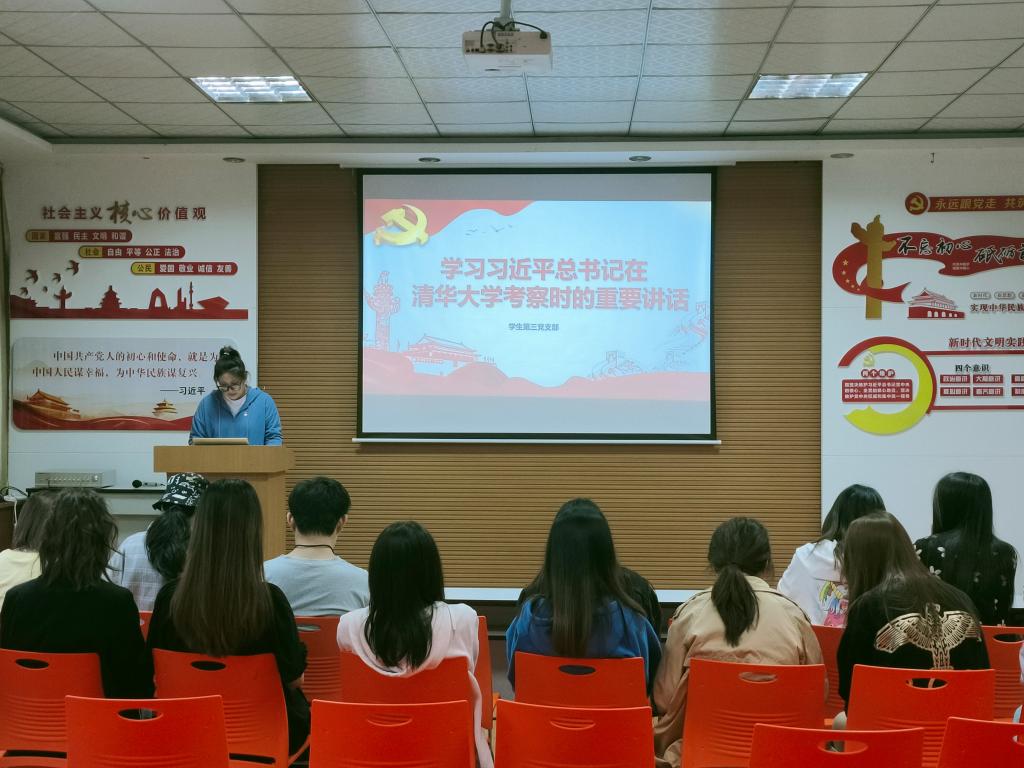 4月30日中午,学生第三党支部在学院党员活动室组织学习习近平总书记在清华大学考察时的重要讲话精神,支部书记张晓宾主持会议,全体党员参加。