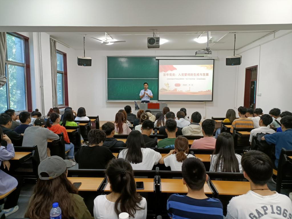 会上,李聪老师从中国共产党入党誓词的生成语境、早期版本、发展、质化、研究启示等方面对入党誓词的形成过程和内涵做了生动详实的讲解。首先,李聪老师通过对马克思和恩格斯建党思想、中国传统誓言文化、中国社会的实践等分析了入党誓词的生成语境。随后,李聪老师分别从土地革命、抗日战争、解放战争和社会主义时期四个阶段介绍了入党誓词的萌生、发展及质化,重点介绍了入党誓词百年发展研究启示。最后,李聪老师号召同学们必须时刻牢记入党誓词,坚定理想信念,坚定不移地跟党走,把思想和行动、智慧和力量凝聚到实现中华民族伟大复兴中国梦的实践上来。