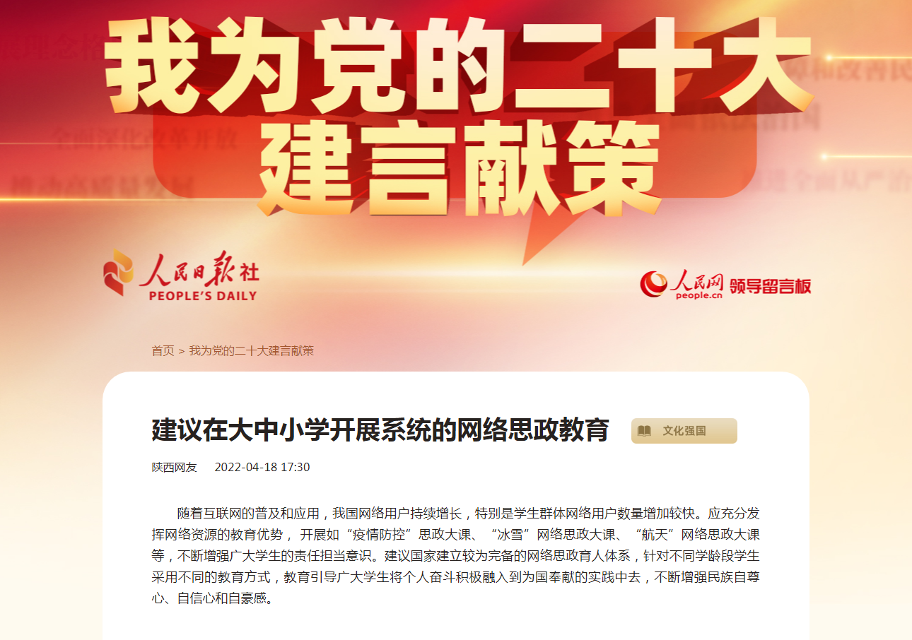 学院党委副书记张晓宾在文化强国方面建言:在大中小学开展系统的网络思政教育,充分发挥网络资源教育优势,开展网络思政大课,建立完备的网络思政育人体系。
