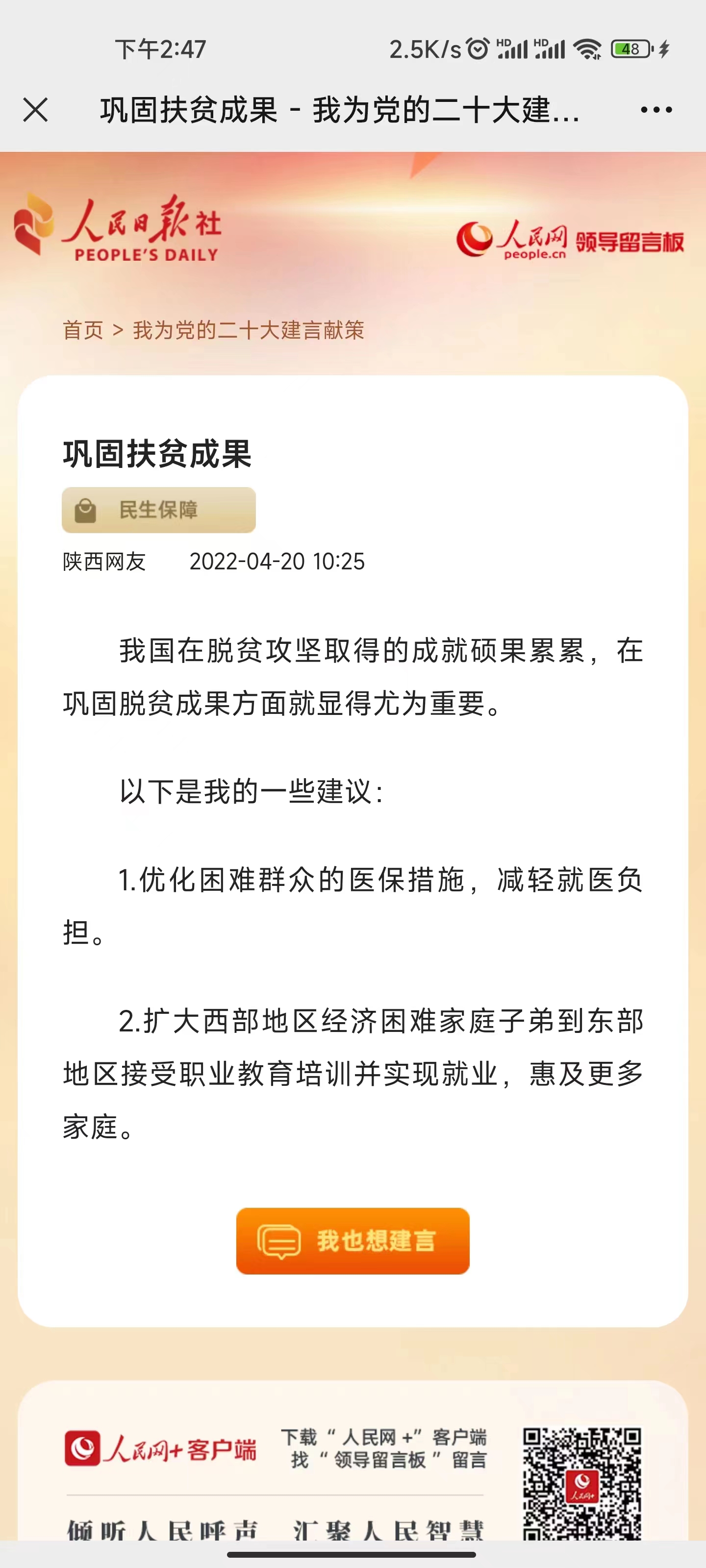 学生第一党支部党员屈宇泽在民生保障方面建言:优化困难群众的医保措施,扩大西部地区经济困难家庭子弟到东部地区接受职业教育培训并实现就业,更好地巩固扶贫成果。