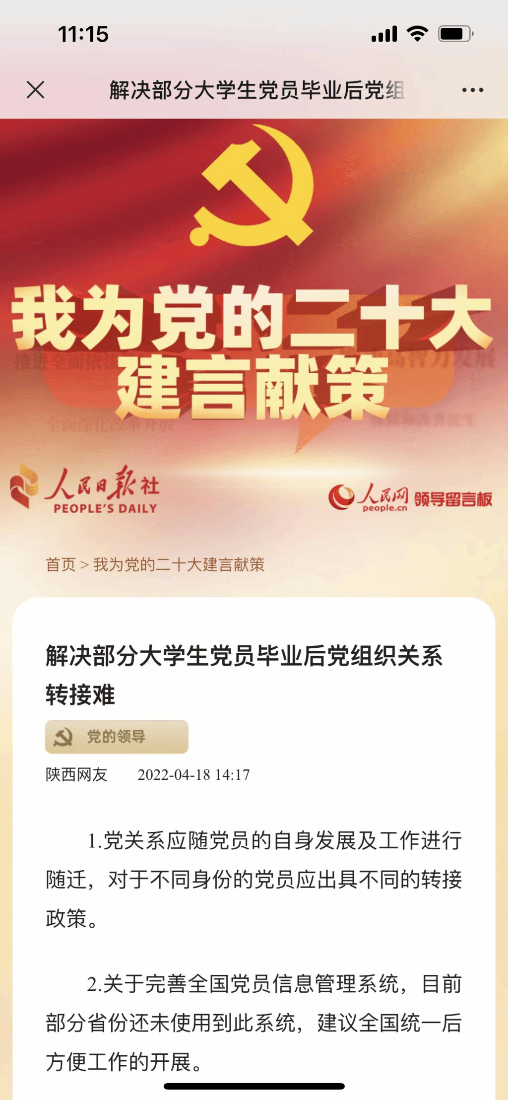 学生第三党支部副书记关淇心在党的领导方面建言:完善全国党员信息管理系统,党关系随党员的自身发展及工作随迁,更好地解决部分大学生党员毕业后党组织关系转接难的问题。