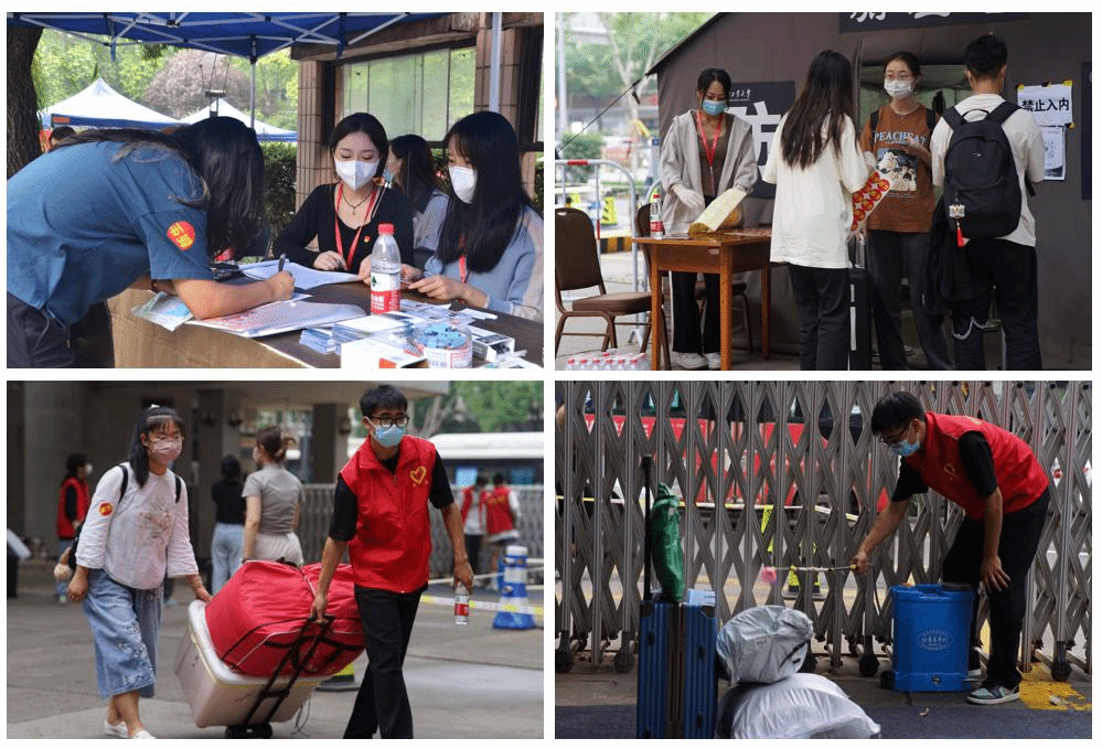 学生志愿者负责校内志愿服务工作,协助做好新生资格审查、生源地贷款、防疫消毒等工作,同时帮助新生搬运行李,耐心地为新生答疑解惑,讲解专业学习经验,介绍学校生活环境,帮助新生尽快适应大学学习生活。