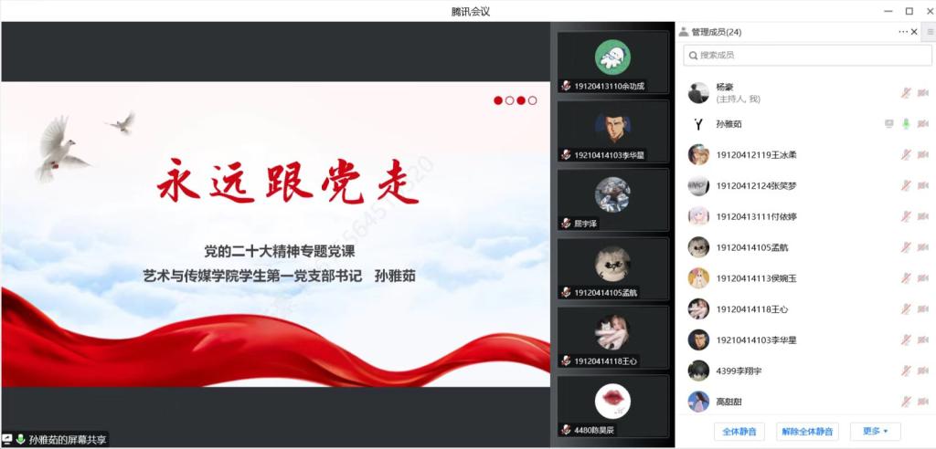 为学习宣传贯彻二十大精神,做好思想政治教育工作,学生第一党支部于12月14日开展“永远跟党走”二十大精神专题党课。支部书记孙雅茹主持,支部全体党员参加。