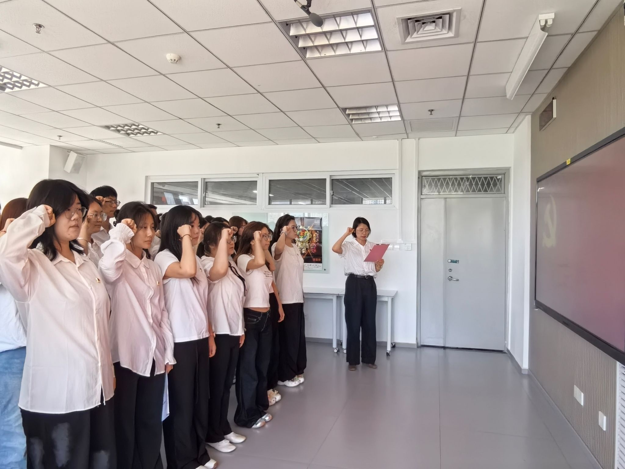 首先,张秀丽宣读了学院党委《对同意接收姜妍汐等36位同志为中共预备党员的批复》。随后,丁西蓓带领全体新党员面向鲜红的党旗庄严宣誓。集中宣誓后,预备党员代表姜妍汐和学生党员代表刘欣发言,院党委书记周著作寄语讲话。