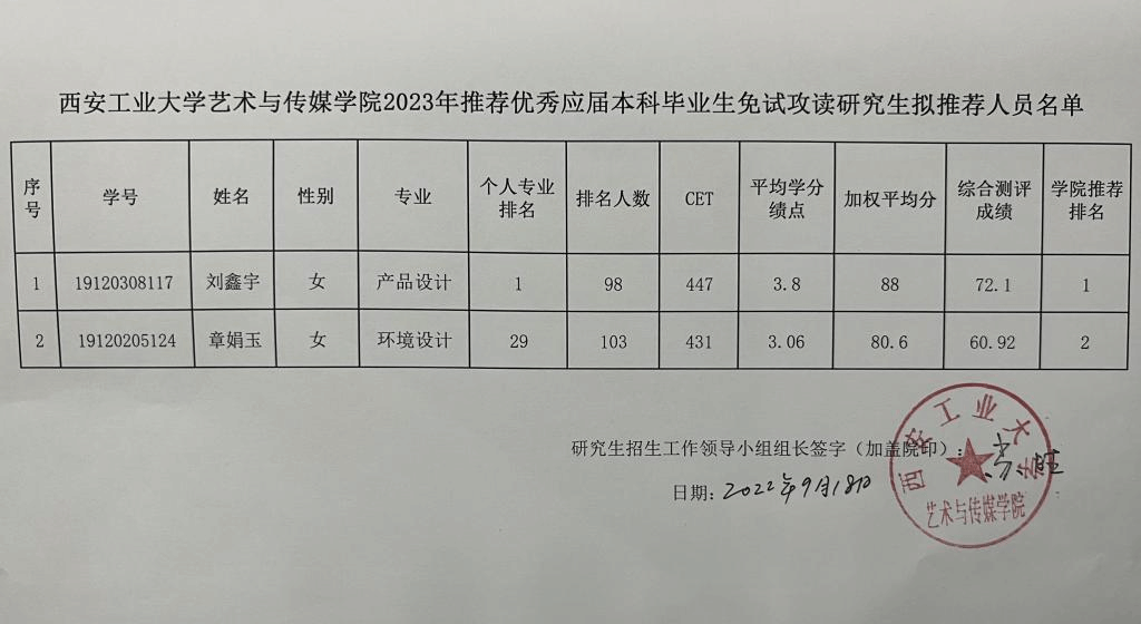 (公示)永利集团艺术与传媒学院2023年推荐优秀应届本科毕业生免试攻读研究生拟推荐人员名单
