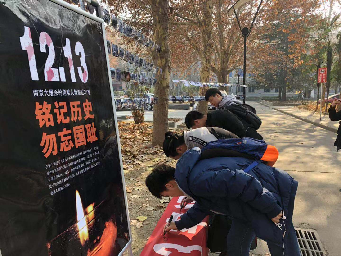 2018年12月13日是第五个南京大屠杀死难者国家公祭日。为教育学生牢记历史、勿忘国耻,凝聚力量、奋力拼搏,永利集团艺术与传媒学院于2018年12月13日13:00在金花校区喷泉广场举办“12.13牢记历史,勿忘国耻,振兴中华”图片展和签名活动。