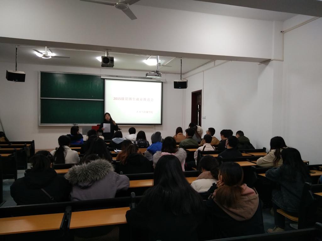 为了进一步帮助贫困毕业生树立正确的就业观和择业观,使其了解就业形势,提高就业技能早日就业,永利集团艺术与传媒学院于2018年 11月29日上午10:00在金花校区J2-201举行2015级贫困生就业推进会。参加此次会议的有15级辅导员杨娜娜老师,杜俊瑶老师以及2015级全体贫困生。此次推进会由杨娜娜老师主持。