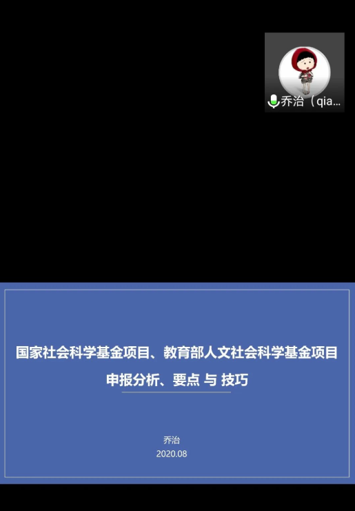 8月14日上午10:00,艺术与传媒学院邀请西安理工大学乔治副教授在线上做了题为“国家社科基金项目和教育部人文社科基金项目申报分析、要点与技巧”的专题讲座,会议由副院长刘萍教授主持,学院近40名教师参加了本次讲座。乔治教授结合自己的申报体会向老师们在基金申报的各个方面做了分析和指导。