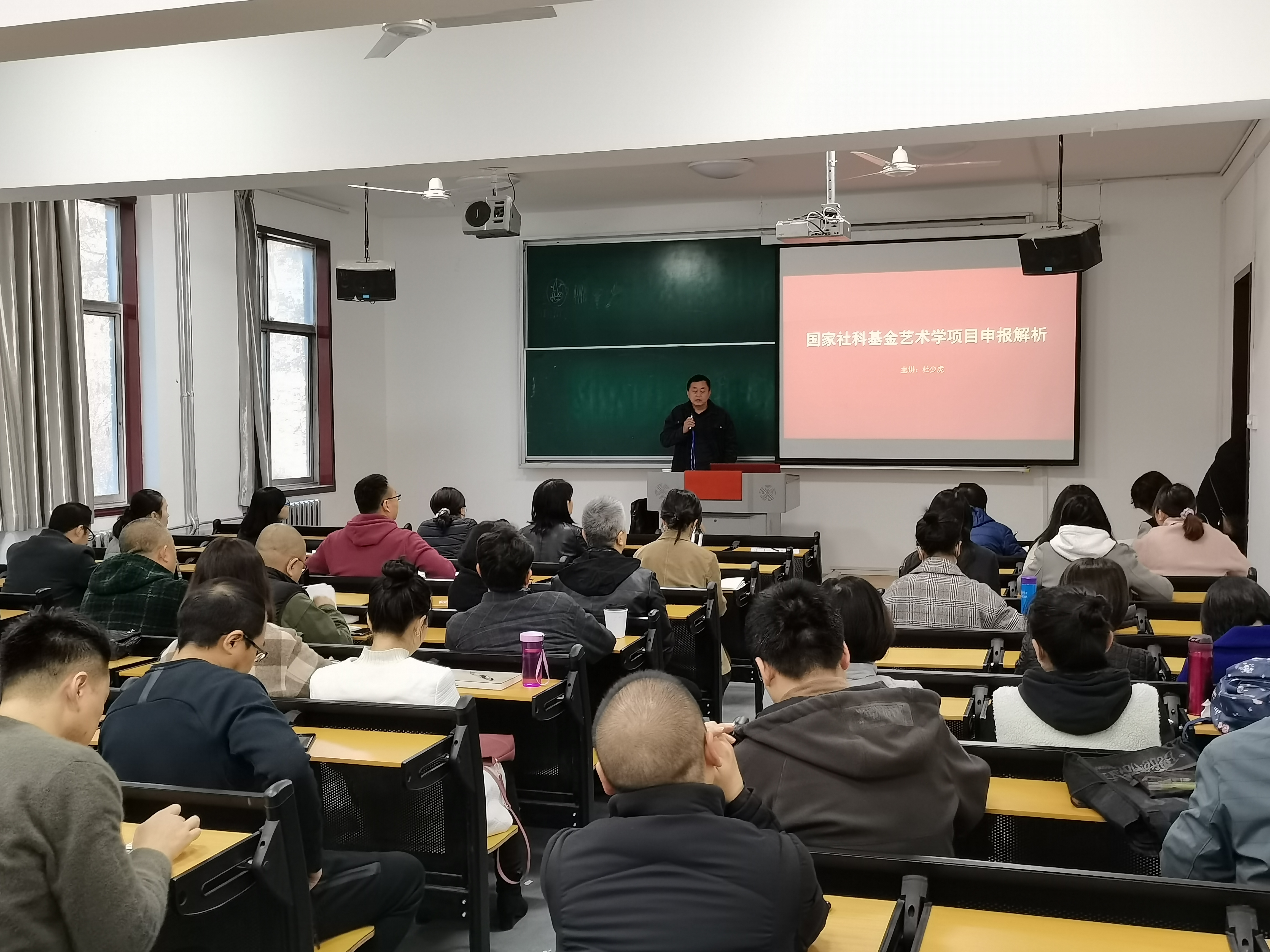 11月11日上午,艺术学院邀请陕西师范大学杜少虎教授,在金花校区教二楼J2-207作了题为“国家社科基金艺术学项目申报解析”的专题讲座。艺术学院副院长刘萍、副院长姚文婷以及学院近六十名教师参加了本次讲座。