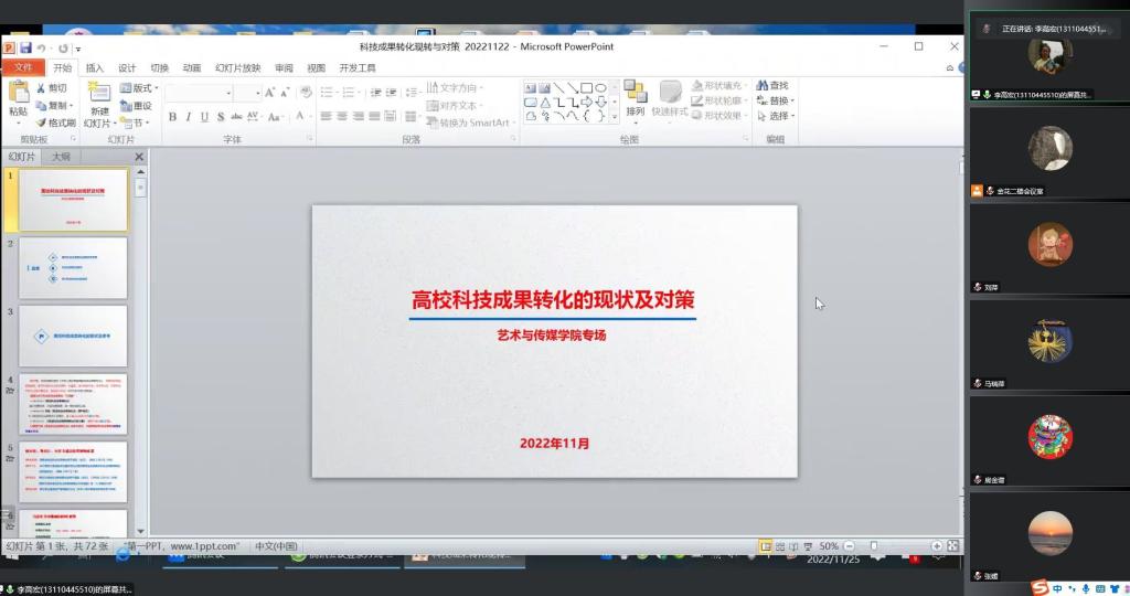 11月25日下午,我院邀请到校科学技术研究院李高宏主任在腾讯会议线上做题为“高校成果转化之现状及对策”的学术讲座,讲座由副院长刘萍主持,学院教师及研究生70余人参加了本次讲座。