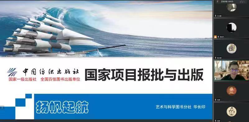 2月20日晚,我院邀请到中国纺织出版社艺术与科学图书分社社长、中国工艺美术学会理论专业委员会副主任华长印,在腾讯会议线上带来了题为“国家项目报批与出版”的专题讲座。院长苏胜、副院长刘萍、姚文婷以及学院七十余名教师参加了本次讲座。讲座由副院长刘萍主持。