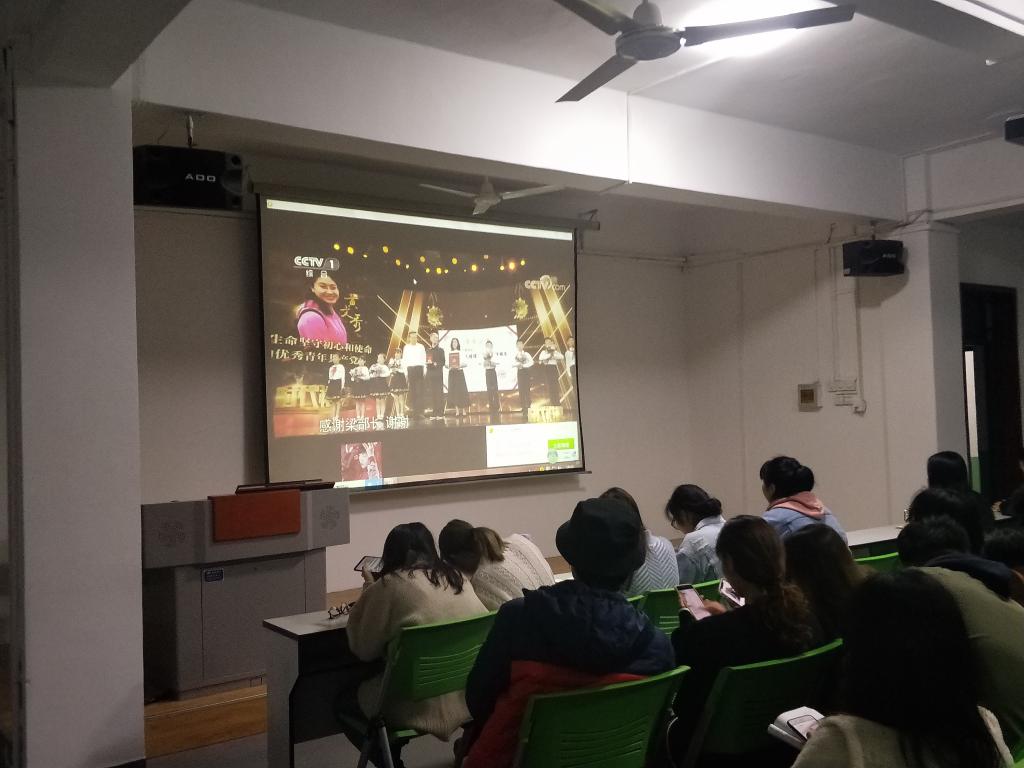 2019年10月28日晚,艺术与传媒学院在教3-325组织学生党支部全体党员集中观看由中宣部集中组织宣传的全国重大先进典型节目“时代楷模—30岁的永恒——黄文秀同志的先进事迹”。
