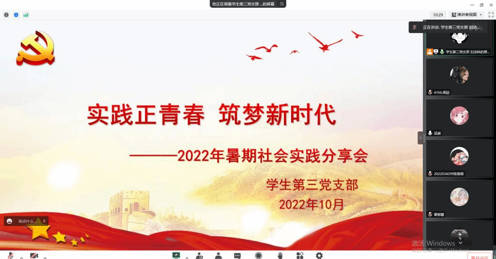 10月18日,学生第三党支部以“实践正青春  筑梦新时代”为主题开展暑期社会实践线上分享会。活动由党支部书记杨娜娜主持,支部全体党员参加。