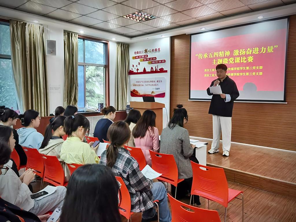 5月4日,艺术与传媒学院学生第二党支部与第三党支部联合举办“传承五四精神,激扬奋进力量”主题微党课比赛,两个支部全体党员参加比赛。