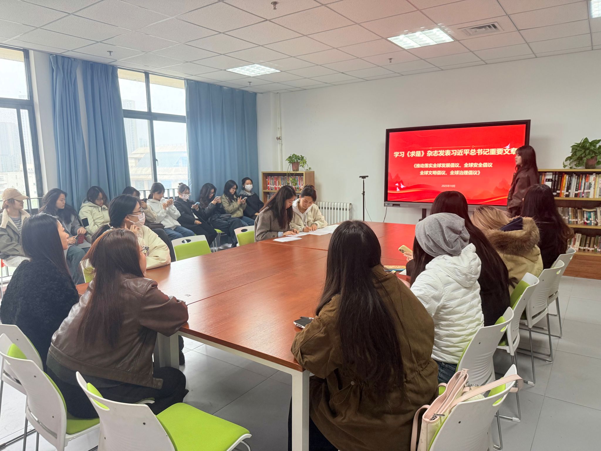 会上学习《求是》杂志发表习近平总书记重要文章《推动落实全球发展倡议、全球安全倡议、全球文明倡议、全球治理倡议》,文章围绕四大核心内容展开:一是明确发展是实现人民幸福的关键;二是强调安全是发展的前提;三是指出多样文明是世界的本色;四是结合世界反法西斯战争胜利和联合国成立80周年,呼吁铭记历史、共创未来。学习后,党员们结合专业实际交流感悟,进一步凝聚思想共识。