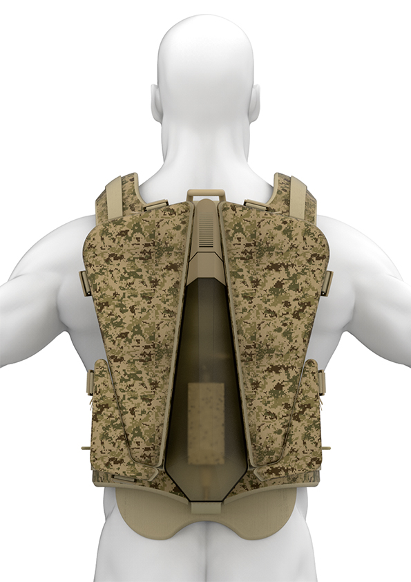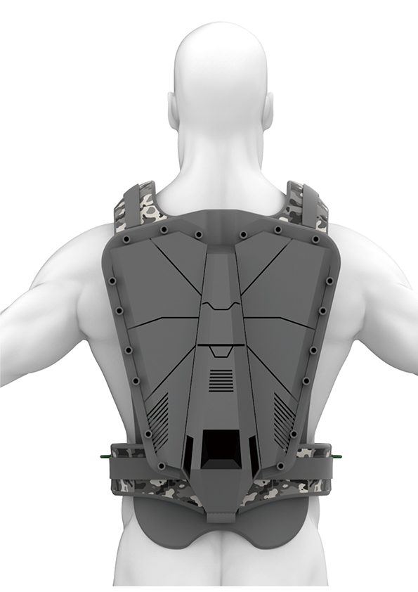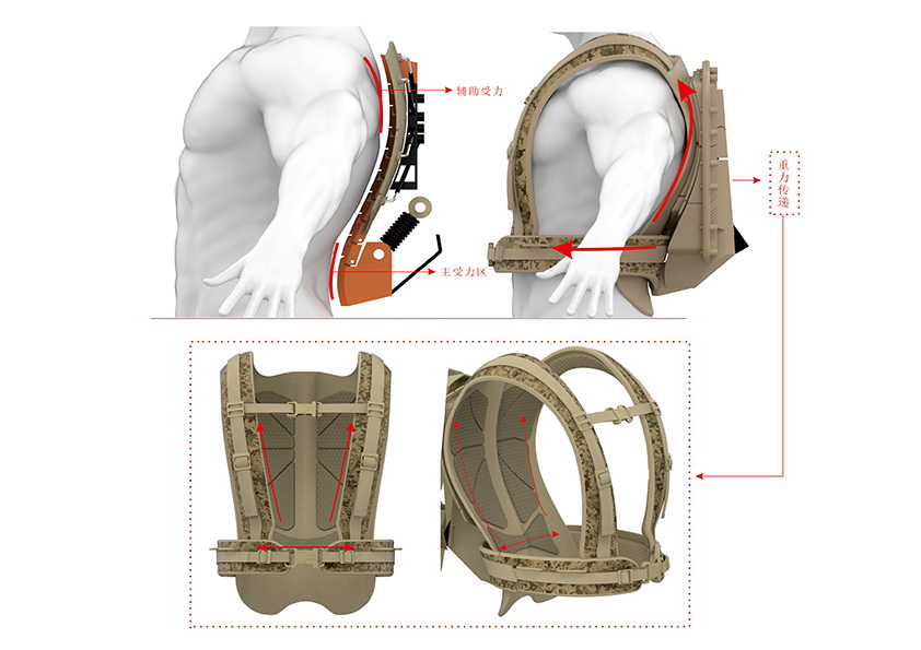 本文分别从军用背包背负和存储两个系统提炼主要的需求目标,并寻找能够与之形成相似性的生物特性。背负系统:主支撑骨架和部分辅助支撑的结合将参照蛇亚目的脊柱与肋骨,以及肌肉之间的结构体系来进行完善;存储系统:主要借鉴蛇头部和腹部鳞片分布进行功能的分配和造型提取,实践中背负系统将外架包与内架包的特点相融合,采用框架形式结合,外架框避免了背部与背包的直接接触,通风性和稳定性更佳;在贴近人体背部的部位,背负与腰带、肩带采用“S”形的设计,既可调整重心也可合理分负重力;这种外挂式的背负系统可以实现一种背负系统搭配不同的作战模块,满足不同的作战单元和需求,这种设计理念更符合课题提出的模块化存储的需求。