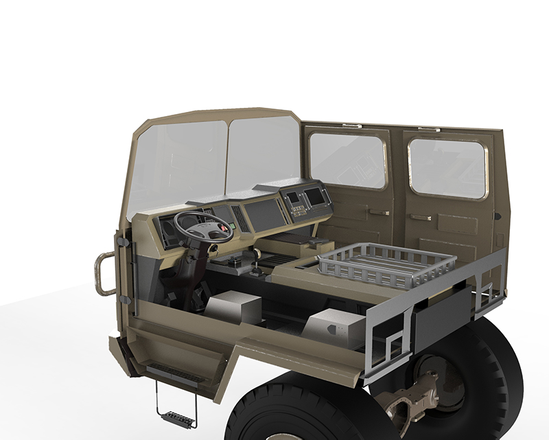 某型号军用特种车辆驾驶室方案系列二为概念设计,在军用特种车辆驾驶室可用性设计原则下,对驾驶室的中央控制台、机舱、操控设备及整体布局进行优化设计。该方案将操作设备与电子设备整合在仪表台与机舱内,并设有可伸缩式武器控制面板,为乘员提供更大的工作空间,提升乘员的操作舒适度。右侧设有盲区辅助显示器,配合车外摄像头可为驾驶员提供更丰富的车辆与路况信息。在武器控制模块部分的设计中,将传统的操控模块转化为贯通式触摸屏幕,加大乘员对战场信息的获取,并提供更多的交互可能性。采用整体性设计语言,将中控与机舱连为一体,在提升视觉效果的同时将设备进一步靠近乘员可达域,提升对空间的利用与操作便捷性。融入多边形设计语言,使得驾驶室整体充满科技感与未来感,增加驾驶室造型美感,有效提升乘员主观满意度。