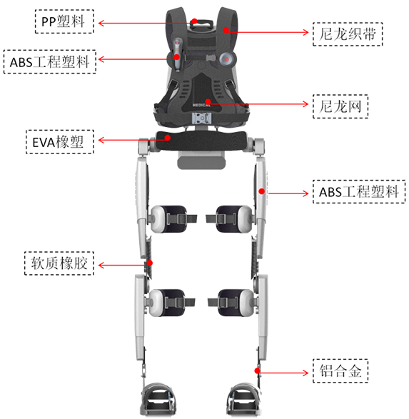 下肢康复外骨骼机器人将造型设计与功能系统相结合,对造型进行合理布局,兼具安全感和轻便感;在贴近人体背部的部位,避免了背部与背包的直接接触,背负与腰带、肩带、腿束采用软质橡胶和尼龙材质的设计,兼具支撑的柔和感和舒适感。在形态上,运用几何面及曲线对动力背包进行整体造型及模块进行分割,突出整体外观设计的简洁感;在分模方式上运用导角处理方式提升整体的精致感。在材质上,选用简洁素净、有质感的整体设计,兼具科技感和耐用感。在色彩上,整体色彩运用以白灰为基调的浅色系,体现出沉稳、柔和的感觉,让病患在使用时,体会到设计者的贴心和其中所传达的人文关怀,更有信心完成康复训练。