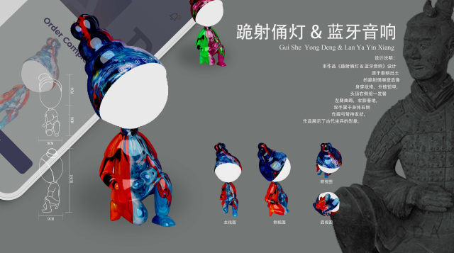 作品:跪射俑灯&蓝牙音箱 创作人员:张宗、张岳、杜家倪 指导教师:周著